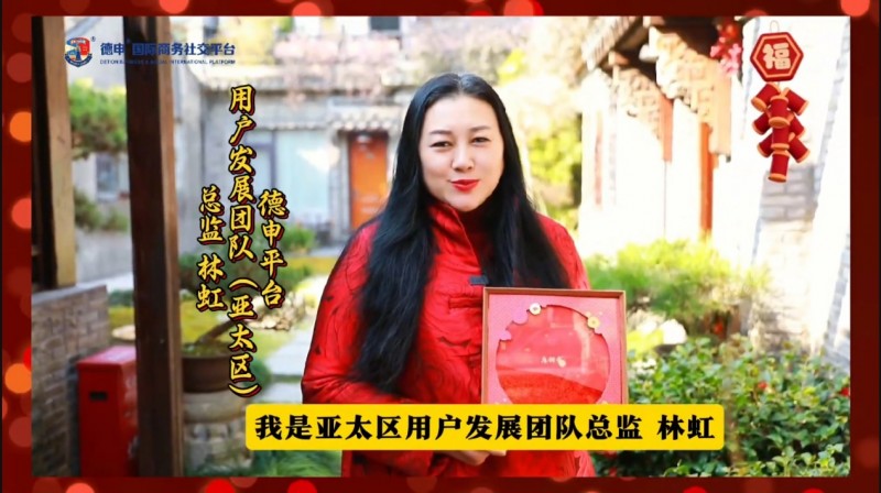 德申平台联合创始人李苹、杨德春,德申平台亚太区总监林虹、德申平台中国区行动团队总监姜丽娟、德申平台中国区用户发展团队总监李欣瞳、德申平台中国区商务社交团队总监王明、德申平台中国区行业兴趣团队总监田洪波、德申平台云拜年大会主席张道雷等分别向全球德申家人送上了新年的祝福。