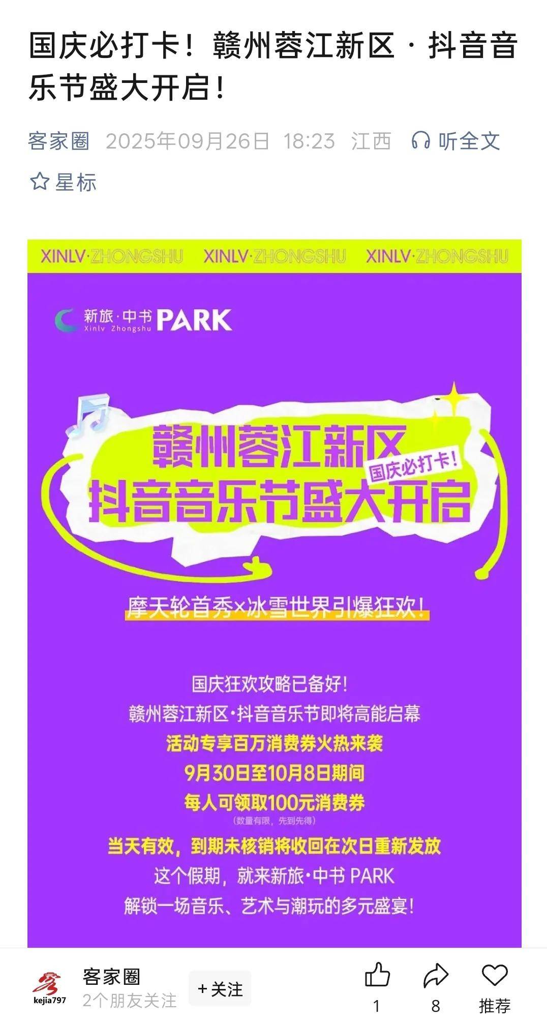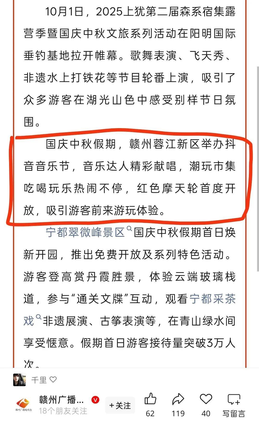 国庆假期(10.1 - 10.3),赣州蓉江新区・抖音音乐节彻底火出圈,累计超9.3万人次涌入,其中不少外地游客慕名前来,现场热闹非凡,欢乐氛围直接拉满,妥妥成为赣州国庆文旅顶流现场,助推赣州跻身热门旅游城市~