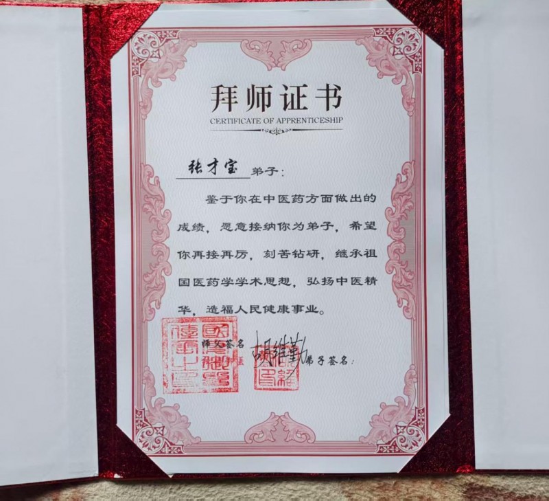 为了不断提升自己的医术水平,张才宝怀着谦逊和求知的态度,拜师红墙御医胡维勤老师。胡维勤老师在中西医结合领域有着深厚的造诣和丰富的临床经验,张才宝跟随胡老师学习期间,如海绵吸水般汲取着先进医学理念和治疗方法。他将胡老师的经验与瑶医特色相结合,进一步丰富和完善了自己的诊疗体系,为患者提供了更加优质、高效的医疗服务。