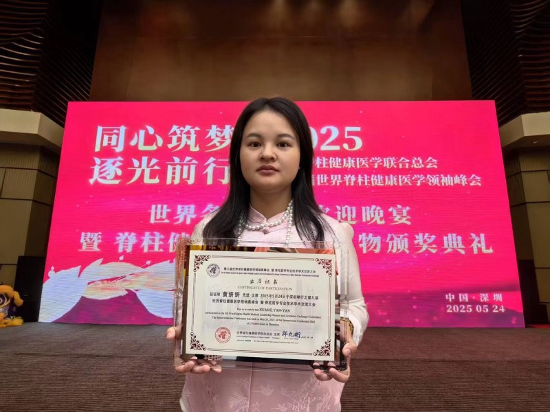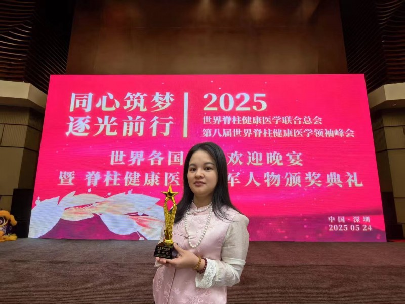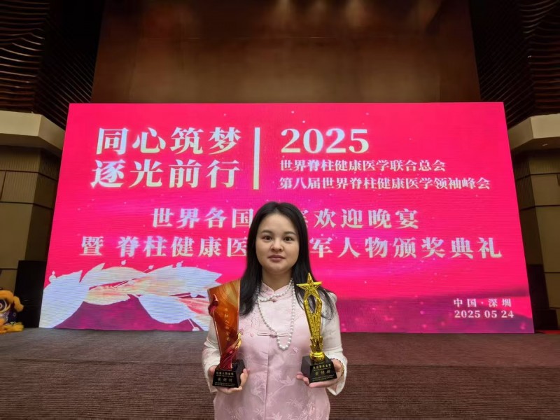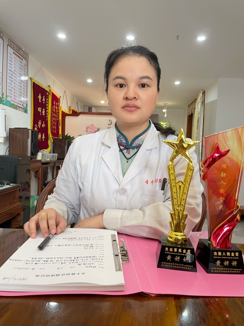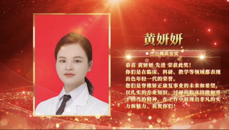 黄妍妍的卓越成就得到了业界的广泛认可和高度赞誉,在第八届世界脊柱健康医学领袖高峰会暨脊柱医学专业技术学术交流大会上,她凭借在脊柱健康领域的杰出贡献,荣获脊柱健康医学领军人物、功勋人物金奖、杰出菁英金奖等多项重磅荣誉,成为中医界当之无愧的佼佼者。