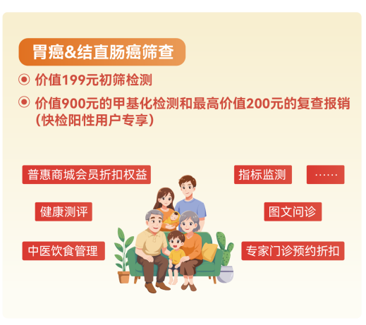 参保人还能享受丰富的健康增值服务,其中价值1099元的胃肠癌早筛服务为您免费筛查,提前预防风险,守护家人健康。