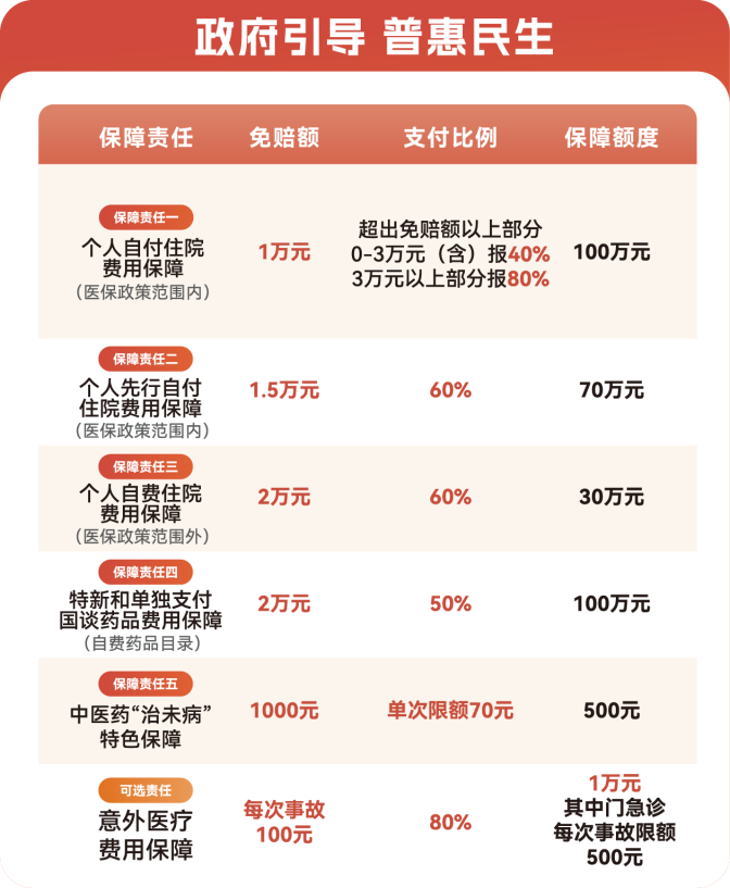 新增“意外医疗费用保障”,只需额外再付38元,因意外产生门急诊及住院费用也能报,医保报销后个人自付部分超过100元就能报,报销比例高达80%,尤其适合老人和小孩。