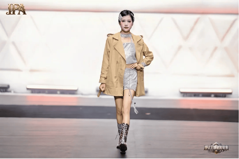 在「造极」主题展示环节,卡其色风衣 + 银色亮片内搭造型,李欣悦展现出轻熟与潮酷交织的一面:经典卡其色风衣剪裁利落,肩部肩章设计增添飒爽气场;内搭银色亮片短上衣、同色系短裤,灯光下折射细碎星光,脚踩银色亮面长靴更显挺拔;发间闪钻发饰,让造型在 “轻熟质感” 中透出少女灵动俏皮。她单手叉腰、步伐稳健,以 “卡其色沉稳 + 银亮片闪耀” 的碰撞,生动演绎 “造极” 对 风格多元、品质进阶的探索,每一个 pose 都写满对时尚的独特见解。