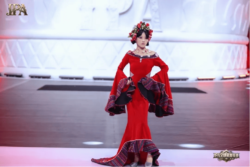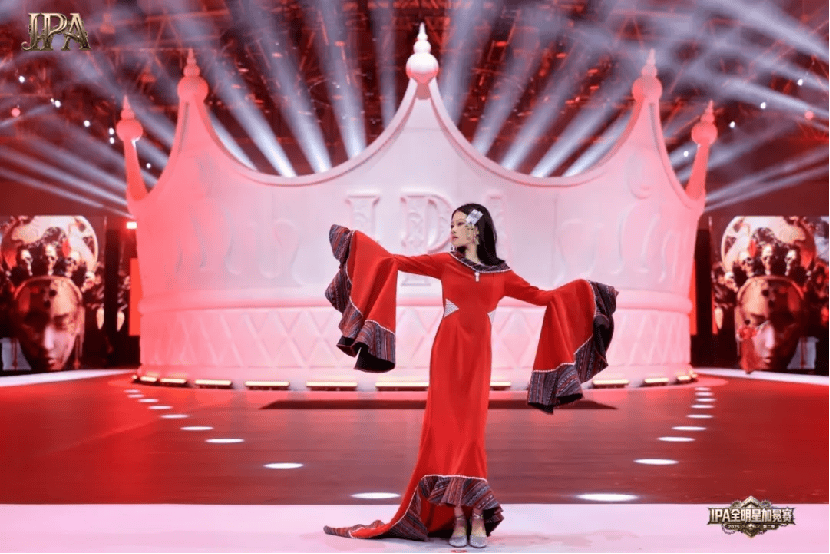 江城大秀环节,李欣悦身着红色民族风长裙惊艳亮相,瞬间成为舞台焦点!红裙以浓郁正红为主调,大喇叭袖边缘缀满彩色织带与精致花纹,既保留民族服饰的古朴质感,又通过修身剪裁与拖尾设计注入时尚张力;她在红调灯光与皇冠造型的舞台背景下舒展身姿,步伐优雅且充满力量,为舞台注入 “传统美学 × 现代舞台” 的独特魅力。