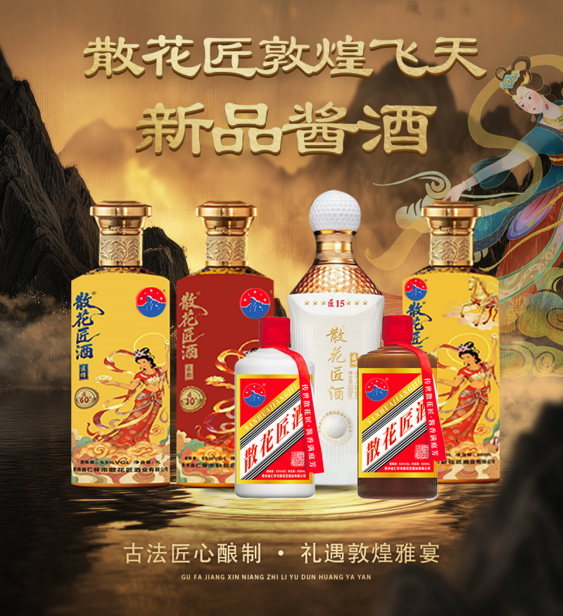 2025 年11月,备受瞩目的散花匠酒业发布了“散花匠敦煌飞天系列新品酱酒”,以敦煌飞天 “送福” 文化为核心,融合百年酱香工艺,不仅是散花匠酒业在产品研发与文化传承上的又一突破,更为高端酱香白酒市场注入了全新活力。