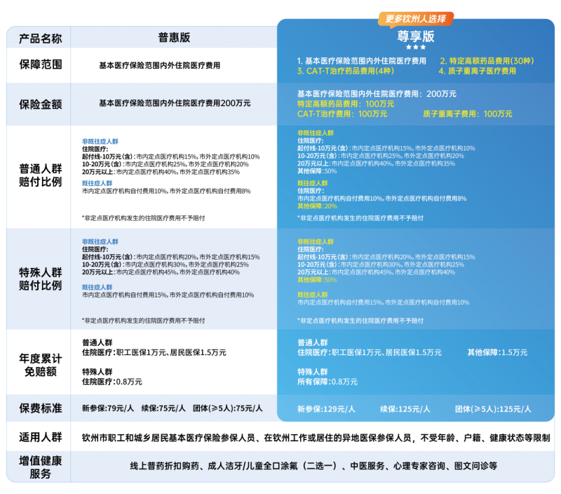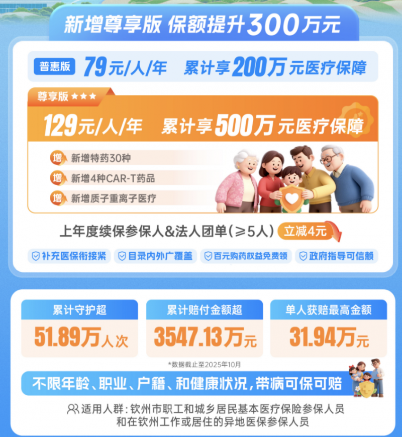 今年,“钦惠保”全新升级,在保留79元“普惠版”产品的基础上,全新推出129元“尊享版”,保额提升300万元,责任更多,保障更全。