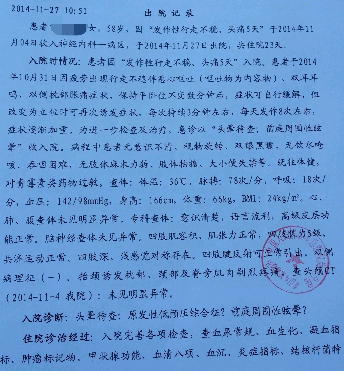 宋**,女,60岁,家住长春市绿园区,2014年2月5日就诊。眩晕半年,加重1月余,头晕不清,时旋转、恶心,反应迟钝,记忆力明显下降,伴失眠,反复发作,查CT未见异常,多处求治无效,特回老家找本医治疗。舌质红少苔,边齿痕,脉沉虚数,血压130/80mmHg,诊断:眩晕(脾虚肝郁),予柴陈泽苓汤5剂,配合醒脑针刺法,针后即觉头脑异常清醒,当晚开始头晕消失,3天内,诸症明显日渐好转,未服任何西药,眩晕未作,头脑清楚,睡眠良好,连续服药并针灸半月,痊愈返回长春。