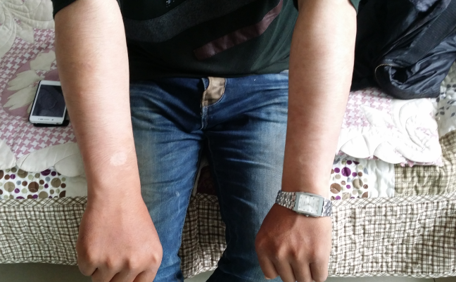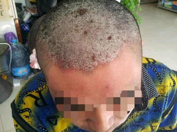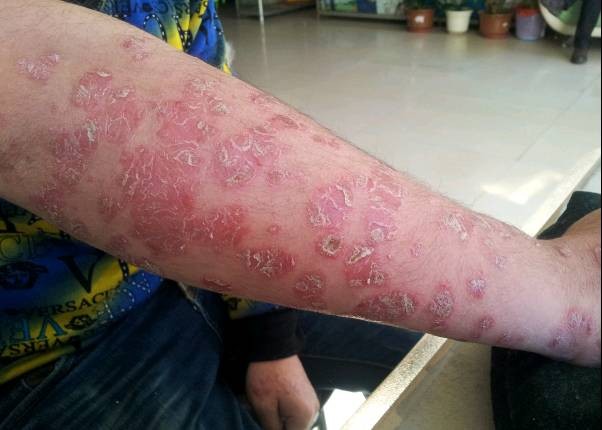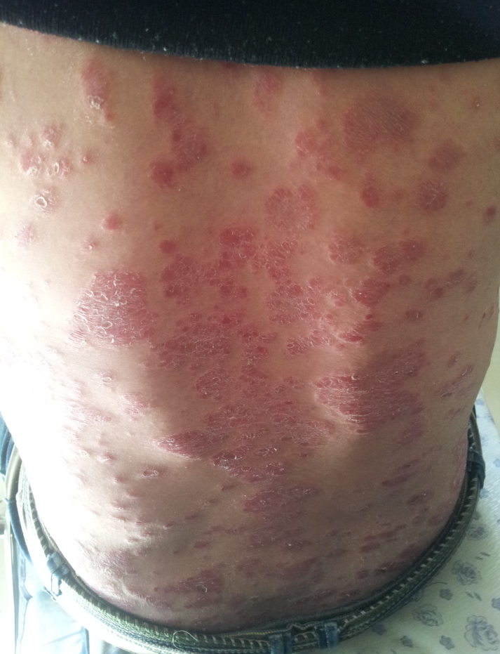 白**,男,31岁,患严重银屑病(见图)两年,多方中西医治疗无效,并因大量用激素导致股骨头坏死,经本人辩证施治3个月,彻底治愈。