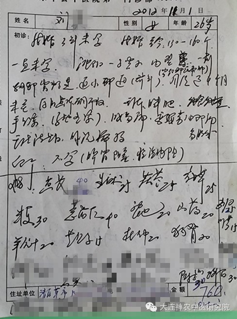 不孕症验案3:刘*,女,26岁,辽宁抚顺市清源县草市镇,2012年11月1日就诊,结婚3年未孕。2年前去沈阳某不孕不育专科医院检查:子宫幼小,内壁薄,一侧输卵管粘连,宫颈那氏囊肿,行输卵管通水通畅,但一直未怀孕。现症:能食能睡,身体肥胖,结婚后3年体重由130斤增加到160斤(身高158cm),月经一直不规律,经常延后,常2-3个月一行,需服黄体酮而使月经来潮,现月经又停闭4个月,伴腰痛,弯腰劳动腰痛甚,易脱发,手足凉,夏热冬寒。舌质淡,苔薄白,脉沉濡。诊断:不孕症(脾肾阳虚,痰湿内阻),予温补脾肾,化痰通经之中药汤剂加减,前后共服40剂,月经来潮,此后一直规律。2014年3月31日随访:已于2013年7月怀孕,现已近临产期。(附病例照片)