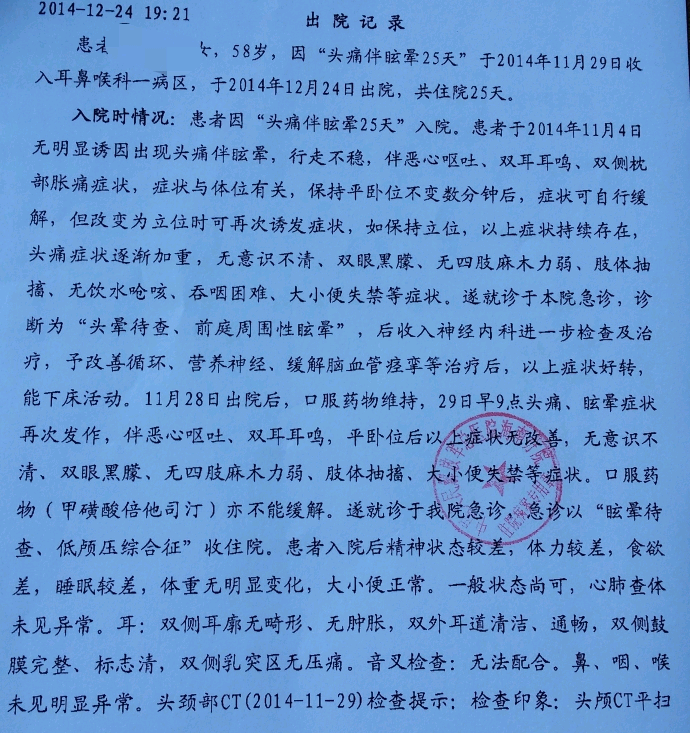 王**,女,71岁,东丰镇人,2014年1月22日就诊。眩晕反复发作20余日,西医诊断:腔梗、冠心病,住院静点治疗,稍好几日,仍旧复发,反复住院4次,一直眩晕不止。患者以为不可能治愈了,失去治疗信心。后在亲属力荐下来我处求中医治疗。刻诊:头晕不清,行立不稳,须人搀扶,面色青黄萎暗,神情郁闷,身乏力,无精神,胸闷,心慌,气短,腰痛。发病前失眠,半夜不眠,纳差。舌质暗红边齿痕,苔薄,脉沉弱。诊断:眩晕(心脾两虚,肝经郁热),予治眩特效方5剂,同时配合醒脑针刺法(因患者孤贫,针灸免费,药品优惠),次日头晕即明显减轻,第3日已能独自步行一公里前来针灸。第5天自述:头脑格外清楚,眩晕消失,走路平稳,心情舒畅。效不更方,上方加减出入再服15副,并一直每日免费为其针灸,随访两个月,头晕一直未发作,痊愈。