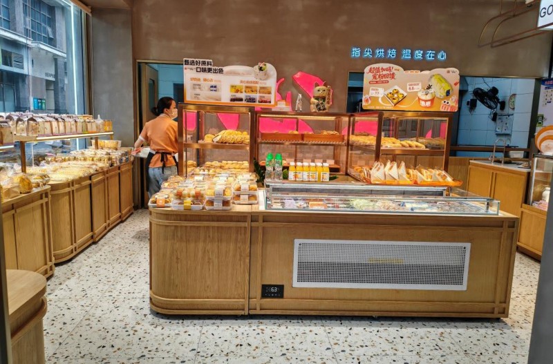 在产品方面,金手指推出多款明星产品,如岩烧榴莲软欧、菠菜肉松芝士贝果、丹麦披萨等,涵盖面包、蛋糕等多个系列,满足不同消费场景与口味需求。店内环境与产品陈列也经过精心设计,暖色灯光与特色专柜营造出温馨舒适的购物氛围。