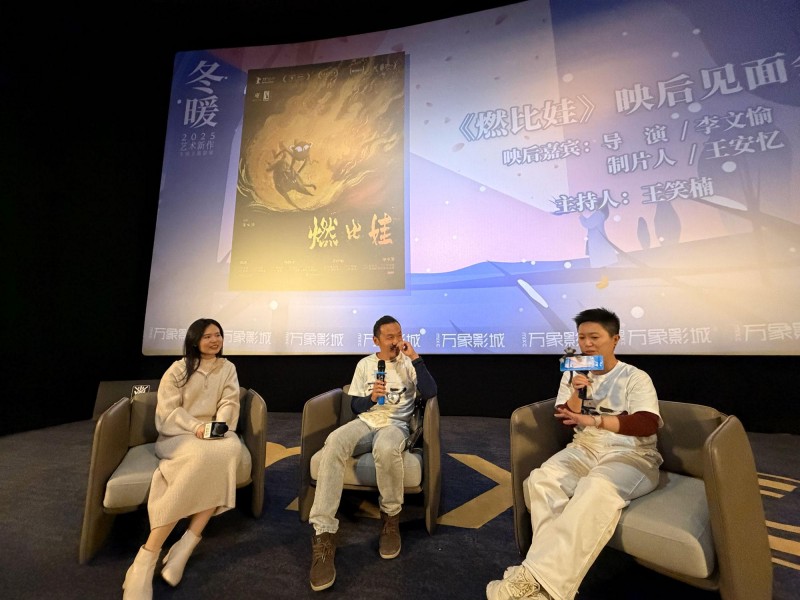 12日晚,导演李文愉和制片人王安忆携上海美术电影制片厂出品的动画电影《燃比娃》首度与武汉观众见面。影片从对羌族神话的当代重构,到画风中的恣肆笔墨,再到台词里的诗意长河,无不彰显着鲜明的“上美影”美学气质。首度开启动画长片创作的李文愉在对谈中表示,相较于原本神话故事中“盗火”的结果,自己更想将刻画重点放在人物的成长过程上,影片中燃比娃从猴子进化为人的情节,便是一个更为宏大的“成长”概念。对于燃比娃和狗狗的关系塑造,则是他想要表达的另外一个核心:“陪伴。”面对观众对画风的赞许,李文愉坦诚自己并不擅长国画,而是被宣纸和笔墨带来的自然肌理所吸引,最终耗时三年,将五万余张手稿凝结于八十五分钟的影像里。和观众的交流中,王安忆回忆起与配音演员周迅相遇并最终实现双向奔赴的细节,并当众“披露”周迅在配音时发现导演作画失误的囧事,引发观众的热烈反馈。