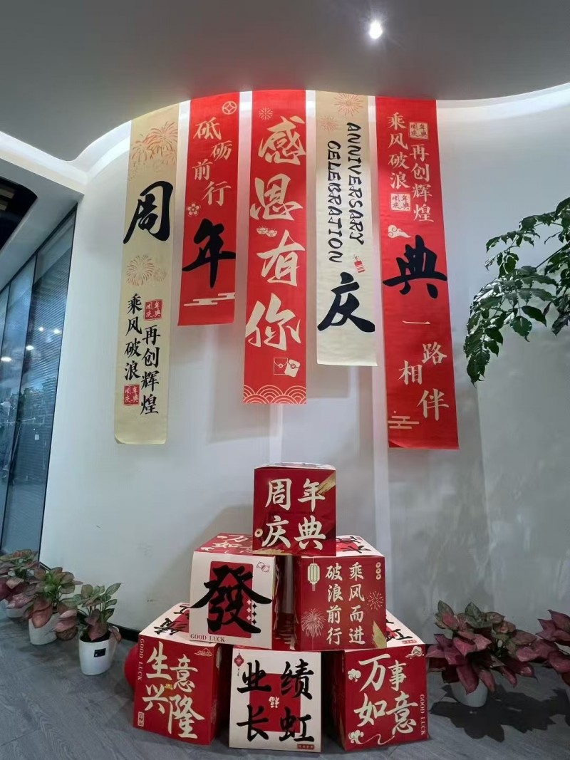 “廿载风华,针绣春秋,织就辉煌。承继春之韵,纳海霞之辉,志高扬……” 苍劲有力的墨迹在相框中静静诉说着韵格的故事。词句中提到的“针藏匠心裁锦绣,线牵福泽盈仓箧”,不仅是对韵格过去成就的点赞,更是对企业未来“财泽绵厚日月长”的美好祈愿。这种书香与墨香的交织,将庆典的仪式感推向了艺术的高度。