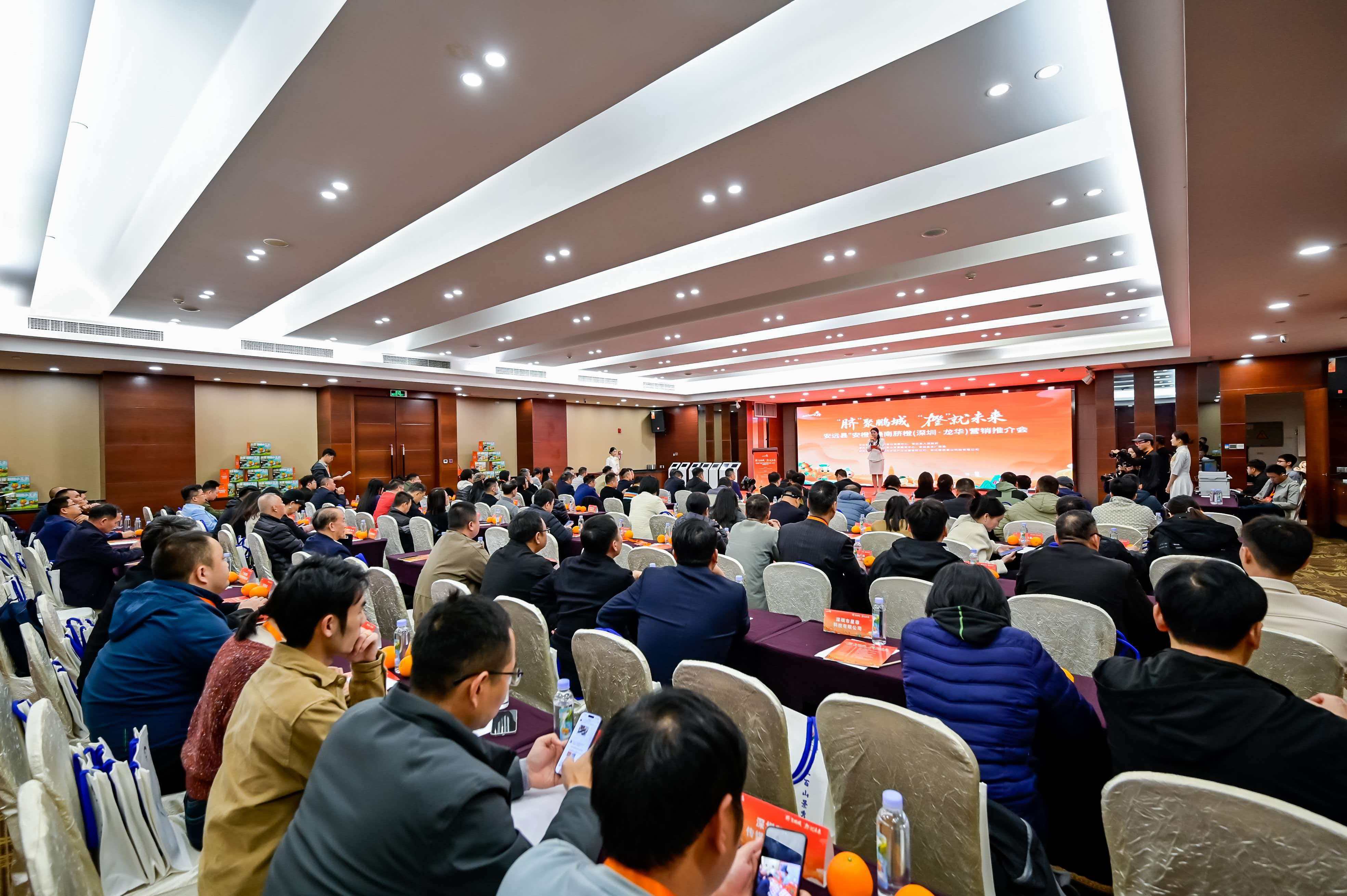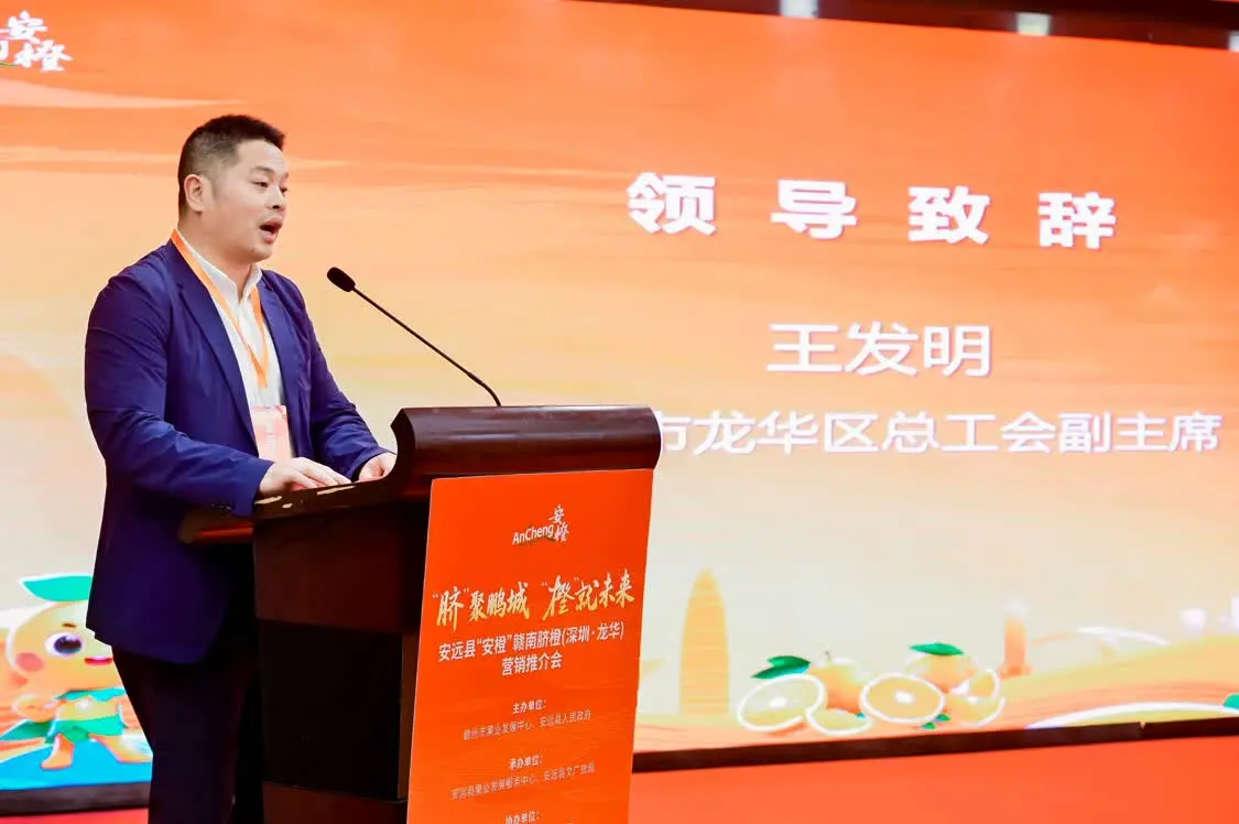 2025年12月26日下午,由赣州市果业发展中心、安远县人民政府联合主办,安远县果业发展服务中心、安远县文广旅局承办的“安远县‘安橙’赣南脐橙(深圳·龙华)营销推介会”在深圳成功举行。此次活动以“‘脐’聚鹏城 ‘橙’就未来”为主题,旨在搭建革命老区特色农产品产销对接桥梁,推动安远优质产品走进大湾区市场,助力乡村振兴战略落地见效。