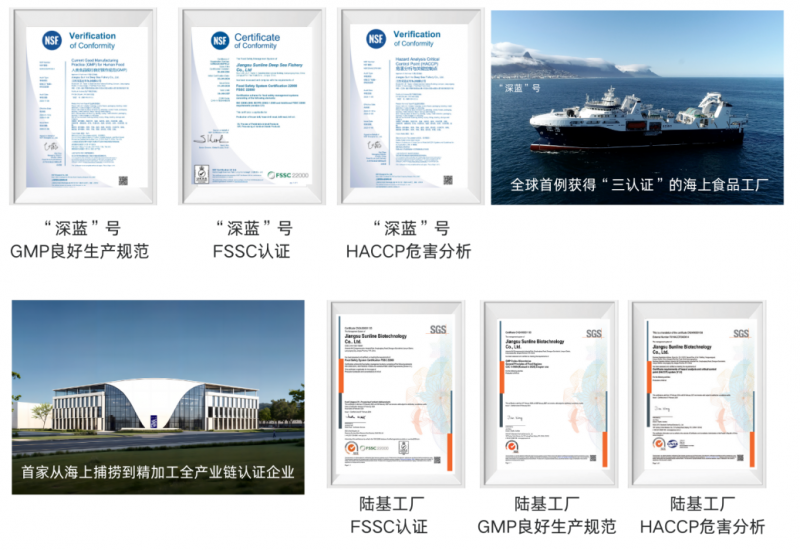 在南极磷虾高值化生产端,深蓝BREAKER®南极磷虾油工厂顺利通过GMP、HACCP、FSSC22000等品质认证,是全球首家从海上捕捞到陆上精深加工全产业链获得此认证的企业。