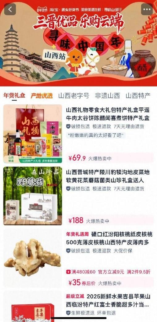2026 年2月8日至2月28日,由山西省商务厅指导的 “三晋优品 乐购云端”线上消费促进活动,在淘宝平台上线专题页面,面向全国消费者打造山西特色年货选购专场。