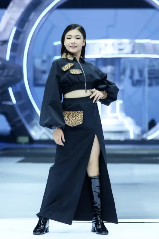 张若馨身着ENNE·小蜜糖品牌的酷飒套装,黑色短款露腰上衣搭配高开叉长裙,豹纹领部与口袋装饰巧妙点缀,将野性与高级感完美融合。灯笼袖设计增添复古氛围,她单手叉腰姿态利落,步伐舒展自信,眼神明亮又坚定,完美驾驭了品牌的潮酷个性风格。