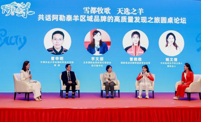圆桌论坛环节,中国农业大学动物科学技术学院教授曾申明、北京国际经贸标准化促进会执行秘书长宇文丽、国家级运动健将速度滑冰冠军曾微微、中央电视台节目主持人姚文倩聚焦高质量发展路径,分别从品种育种、国际标准、健康体验和品牌传播的维度,为阿勒泰羊绘制品牌发展蓝图。