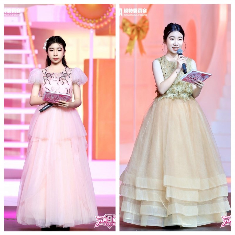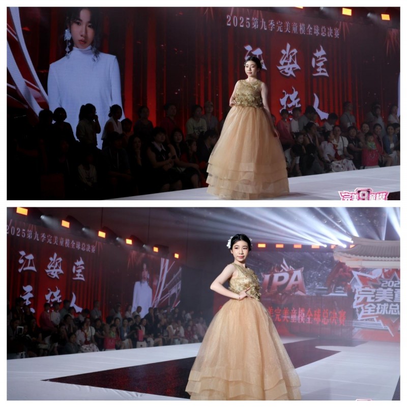 在樱歌令的主题展示中,江姿莹在完美童模总决赛的舞台上宛若秋日暖阳中的公主,身着金色渐变蓬蓬礼服惊艳亮相。无袖设计勾勒出优雅身形,蓬松裙摆如云朵层层叠叠,表面立体花朵装饰在灯光下绽放,仿佛将阳光的温柔与大地的厚重同时披在身上。