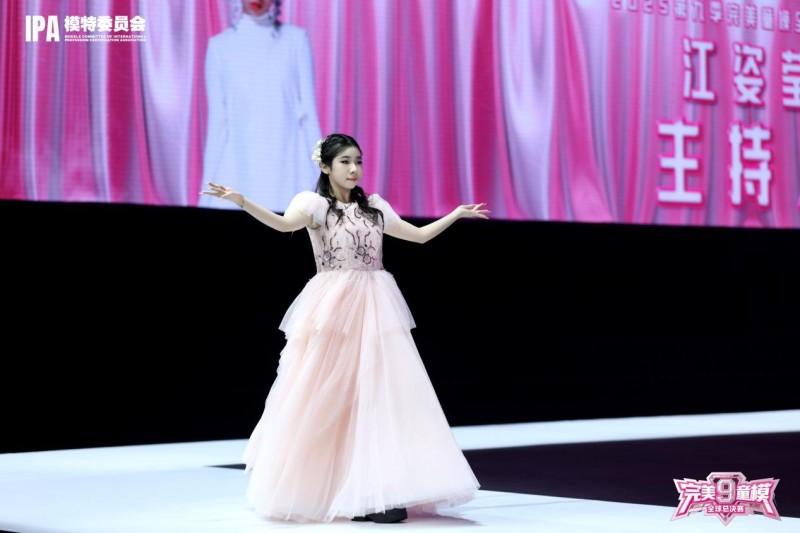 江姿莹在完美童模总决赛的舞台上宛若晨曦中走出的甜美公主,身着粉色无袖连衣裙惊艳亮相。上半身亮片刺绣如星辰点缀,多层薄纱裙摆如云朵般层层绽开,轻盈质感随动作泛起柔光涟漪。