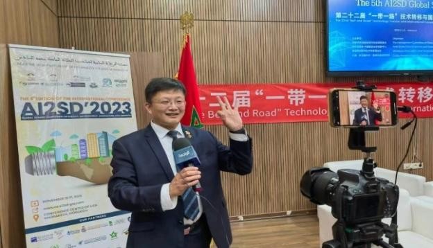 (2023年在摩洛哥举办的第22届“一带一路”技术转移与国家合作创新论坛上邢纪国主任接受摩洛哥国家新闻媒体专访)