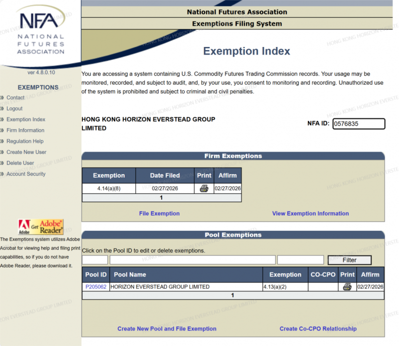 2026年2月28日,香港远恒集团有限公司(HONG KONG HORIZON EVERSTEAD GROUP LIMITED)宣布,集团已在美国 National Futures Association(美国国家期货协会NFA)备案系统中完成 Commodity Pool Operator(CPO商品池运营商)与 Commodity Trading Advisor(CTA商品交易顾问)相关牌照资质豁免备案登记,NFA ID:0576835 ,并纳入美国商品期货交易委员会 Commodity Futures Trading Commission(CFTC)监管框架管理。