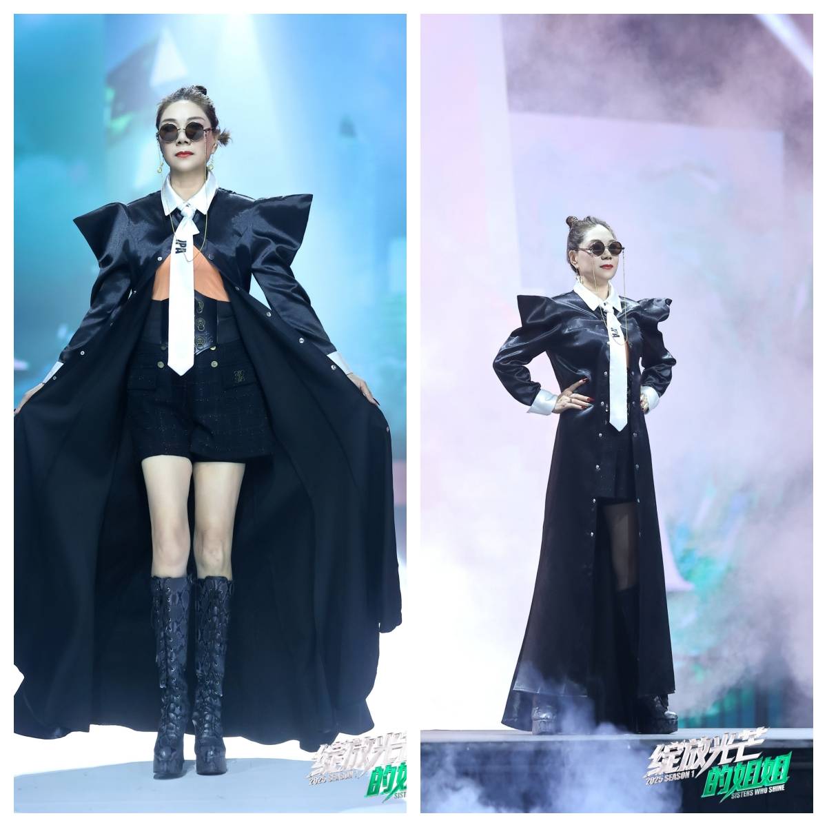 主题秀环节,姐姐姐姐的黑色造型宛如“气场女王”登场。黑色长外套自带“大女主”质感,肩部的立体设计如羽翼般增添凌厉感,内搭与下装的搭配简约却藏着巧思;她脚踩靴子,一手叉腰、一手自然舒展,行走间外套下摆如披风般流动,既有职场女性的干练飒爽,又有女性独有的优雅底气。