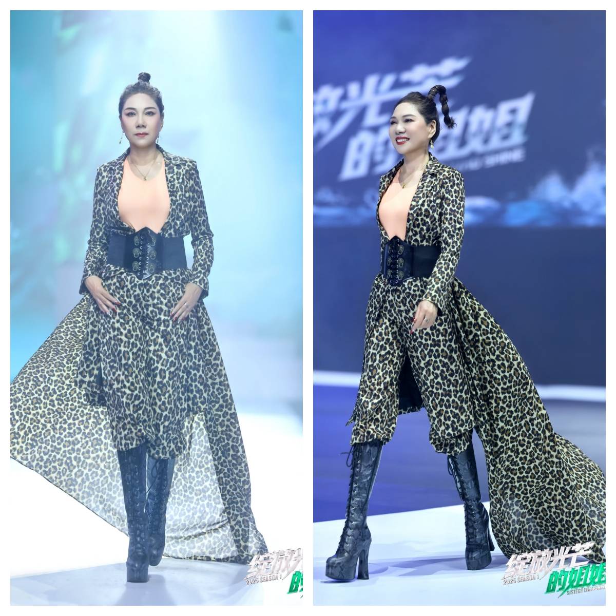 当杜媚姐姐身着豹纹套装踏上 T 台,全场瞬间被她的 “时尚张力” 抓住。长款豹纹外套随步伐轻扬,内搭与同纹下装的搭配,让 “野性” 不再是单一标签,反而与她的气场融合出 “时尚猎手” 的既视感。