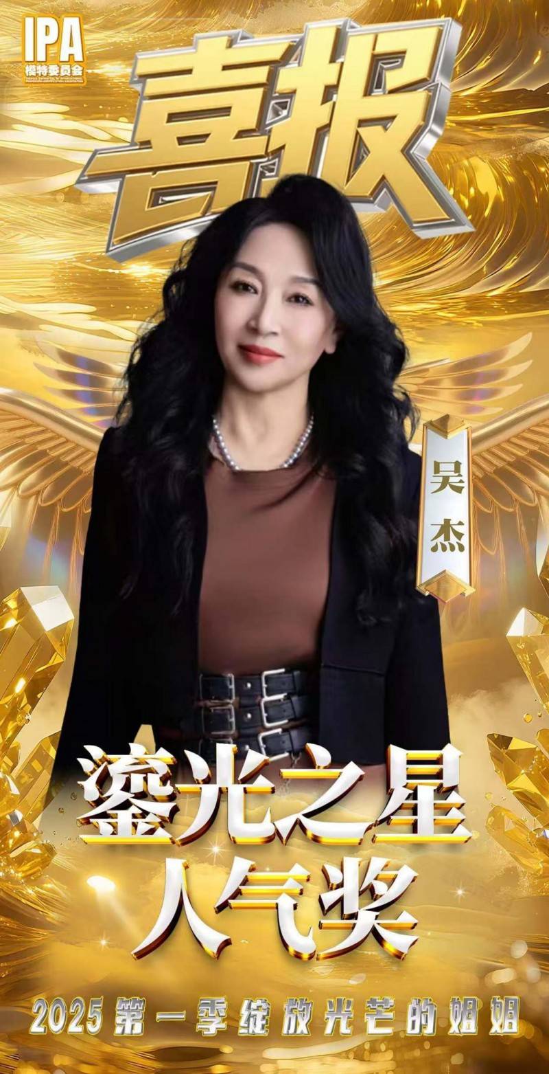 热烈祝贺 吴杰姐姐 在 “2025 第一季绽放光芒的姐姐” 活动中,荣获鎏光之星人气奖!从 T 台秀场的百变风采,到最终颁奖时刻的荣耀登顶,她用魅力与实力,完美诠释了“姐姐绽放光芒”的滚烫内核。
