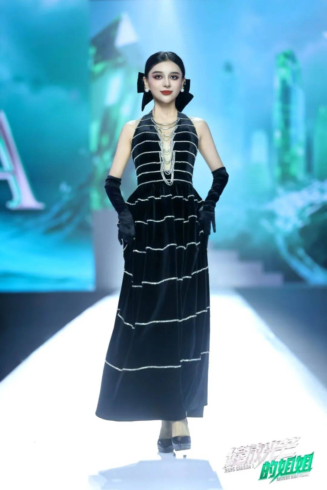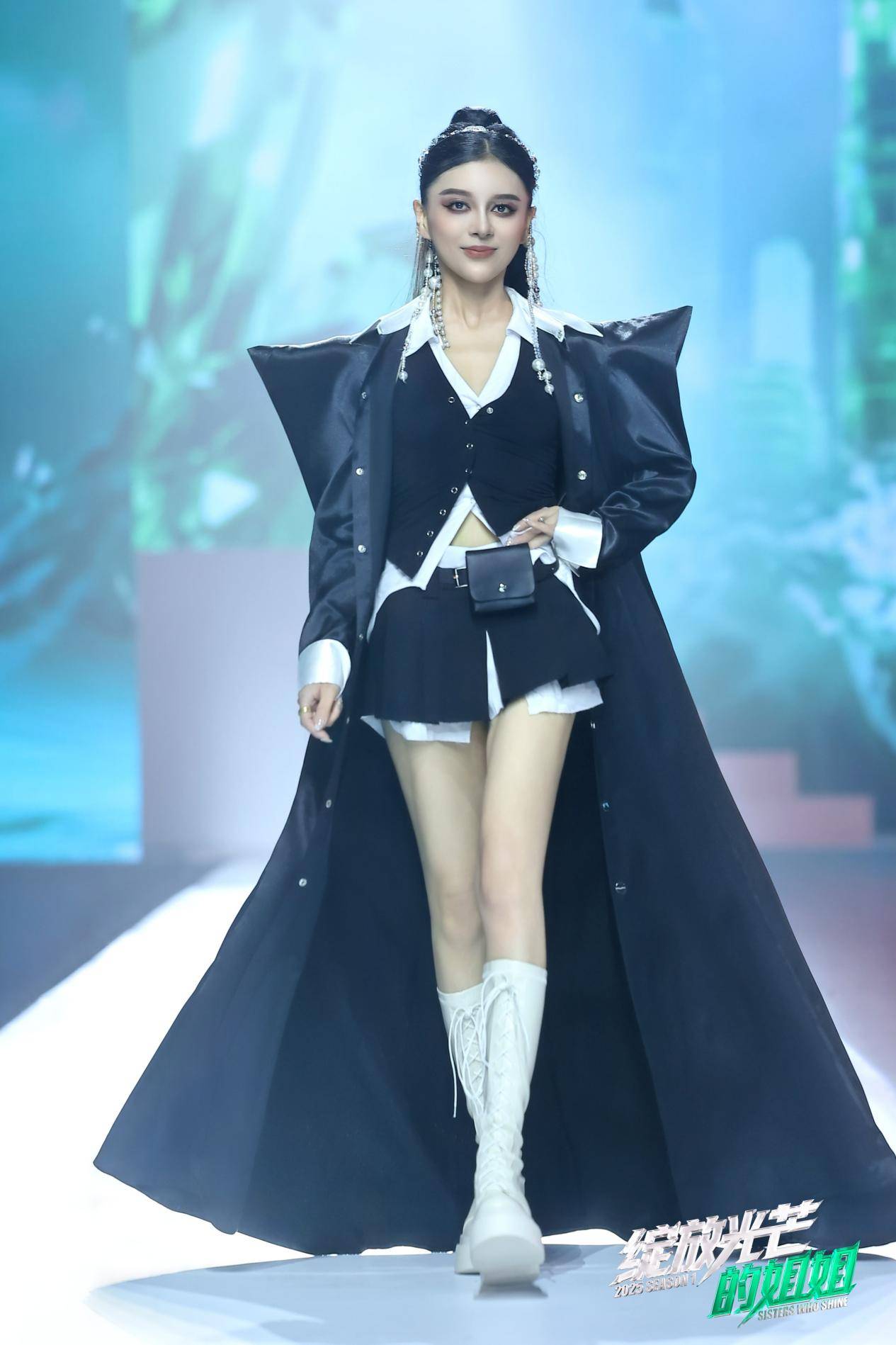 三套造型LOOK,演绎“姐姐”的多元时尚张力。一身黑色超长缎面外套气场全开,内搭黑白撞色短款套装,百褶裙与“下衣失踪”的巧思,搭配白色厚底绑带靴,瞬间拉满 “酷飒值”。夸张的肩部设计、腰间迷你小包的点缀,让造型既有强气场又充满时尚细节;她走在 T 台时,每一步都透着“时尚弄潮儿”的自信锐度。