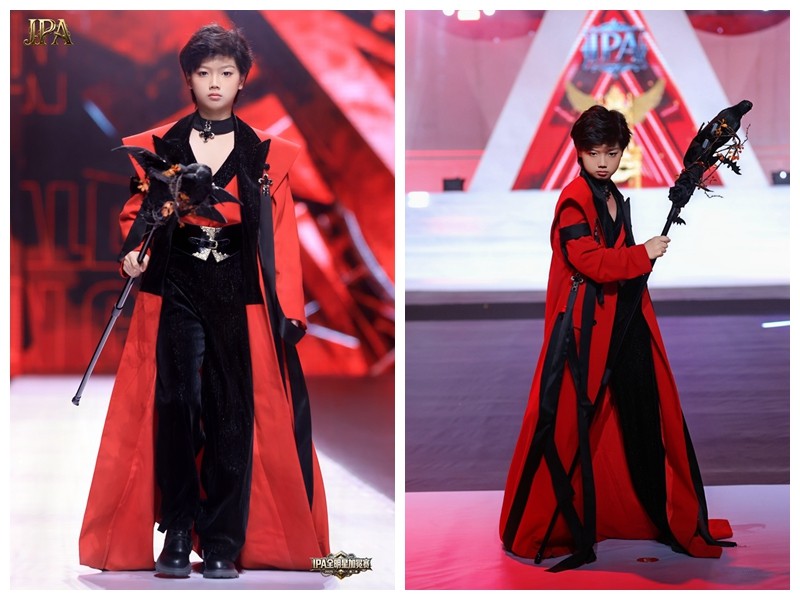 在登峰主题展示中,李允迪身着红黑撞色的长款华服,红色热烈张扬,黑色冷峻沉稳,撞色设计既显层次又充满艺术感;手持装饰着暗黑系精致造型的权杖,整体造型华丽且气场十足。他步伐稳健且富有节奏,手持权杖的动作利落又充满张力,身姿挺拔、眼神坚定有光,将造型的飒爽与 “登峰” 的昂扬斗志展现得淋漓尽致,每一个姿态都传递出向高峰迈进的决心,极具感染力地带动了现场氛围。随着升降台缓缓升起,他立于台上,红黑华服在灯光下愈发夺目,权杖装饰似有光影流转,仿佛从 “巅峰” 向众人展现风采;亮相瞬间聚焦全场目光。