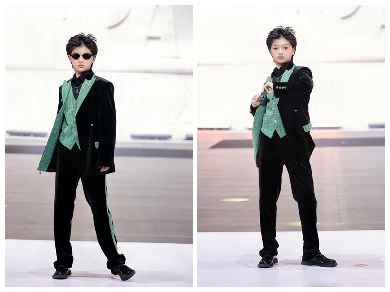 在师生秀上,李允迪像颗裹挟着锐气的小火种,步伐又飒又利落,黑绿交织的造型在他脚下 “活” 了起来,眼神里的光仿佛能击穿舞台,把少年的张扬与时尚的酷劲揉成了一团火。三人同框,步伐像被无形的韵律串在一起,你进我随、你顿我落,黑绿配色的穿搭在灯光下交织出奇妙的质感 —— 每一步都在讲 “师生并肩,让时尚和成长共舞” 的故事,台下的目光仿佛被磁石吸住,连空气里都漫着时尚与温情交融的鲜活气息。