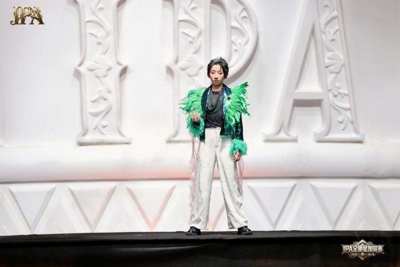 在「造极」主题展示环节,朱家树惊艳亮相——绿色羽毛短款外套如春芽破土般绽放生机,蓬松质感与闪亮材质碰撞出层次丰富的视觉张力,深色堆堆领内搭沉淀出沉稳底蕴,白色闪光长裤则以纯净基底托起整体造型的轻盈感。手持透明球形道具,表面光滑如水晶,在灯光下折射出梦幻光晕。球形象征无限可能,透明材质传递灵动创造力,与绿色羽毛外套的生机感形成虚实呼应,既点睛整体造型的未来感,又暗喻“造极”主题中对极致梦想的追寻——以简约设计承载深刻寓意,完美融合艺术表达与主题内核。