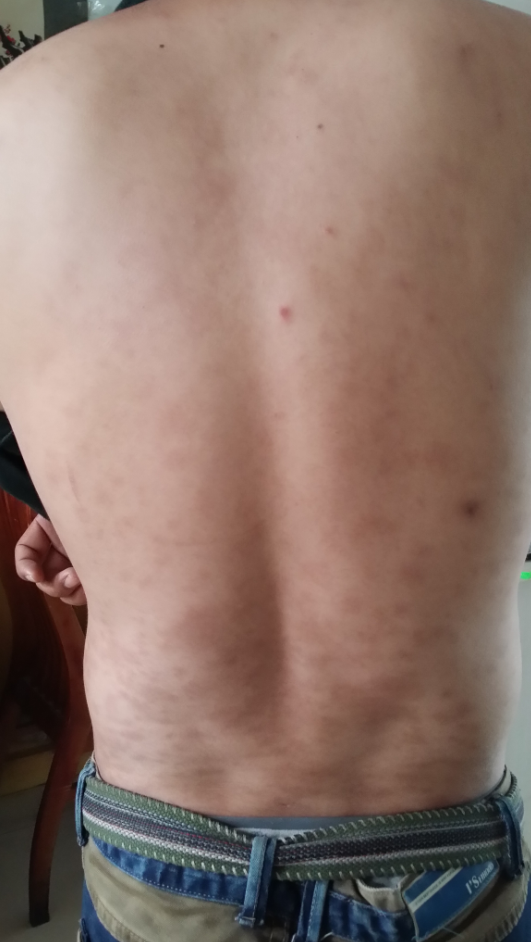 白**,男,31岁,患严重银屑病(见图)两年,多方中西医治疗无效,并因大量用激素导致股骨头坏死,经本人辩证施治3个月,彻底治愈。