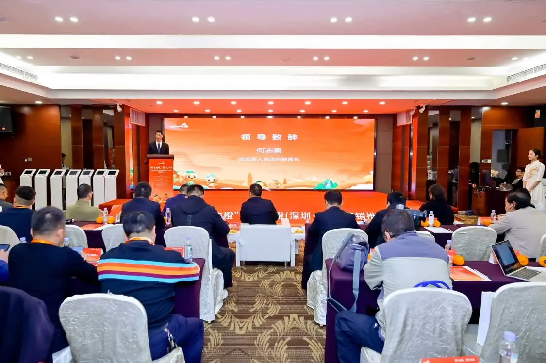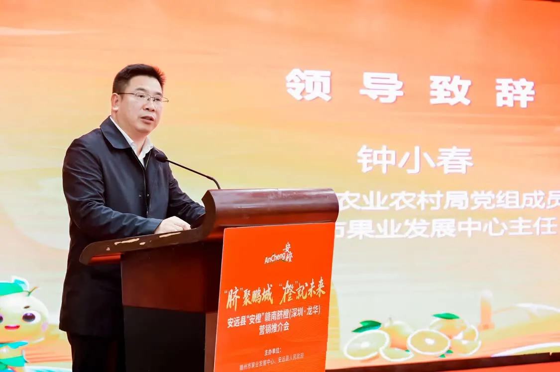 2025年12月26日下午,由赣州市果业发展中心、安远县人民政府联合主办,安远县果业发展服务中心、安远县文广旅局承办的“安远县‘安橙’赣南脐橙(深圳·龙华)营销推介会”在深圳成功举行。此次活动以“‘脐’聚鹏城 ‘橙’就未来”为主题,旨在搭建革命老区特色农产品产销对接桥梁,推动安远优质产品走进大湾区市场,助力乡村振兴战略落地见效。
