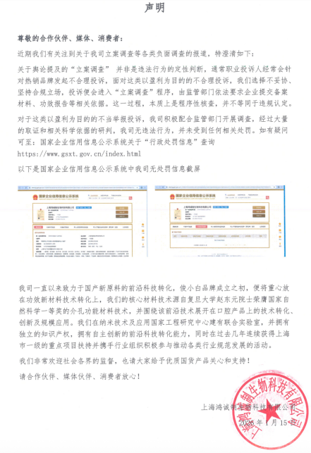 对于近期这类以盈利为目的的不当举报投诉,我司积极配合监管部门开展调查,经过大量的取证和相关科学依据的研判,我司无违法行为,并未受到任何相关处罚。”