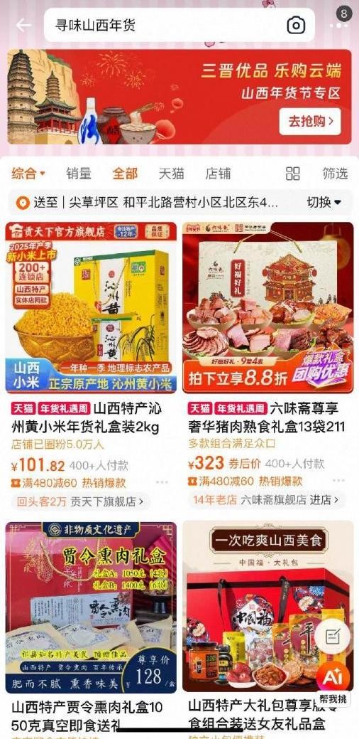 消费者只需在淘宝APP搜索关键词“寻味山西年货”,即可一键直达专题页面,页面内商家商品及店铺直链、扫码或点击就能跳转下单,物流畅享无忧,轻松开启山西好物采购之旅。