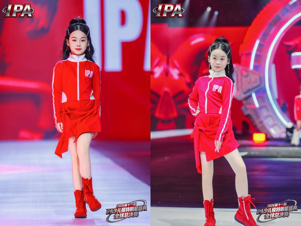 IPA 校服秀环节,她身穿红色 IPA 校服套装利落亮相,干净的剪裁、流畅的线条搭配白色装饰,尽显少年朝气。她步伐铿锵、自信大方,台步稳健且表情灵动,将少年的阳光活力与时尚感完美融合,成为舞台上最亮眼的一抹中国红。