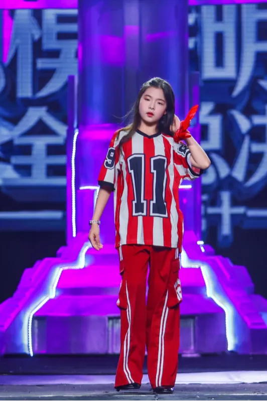张若馨以舞蹈《batter up》燃炸全场!她身着红白条纹 11 号球衣风上衣,搭配红色侧边条纹工装裤,手腕系上红色丝带,将运动街头感与活力感拉满。在紫粉霓虹舞台灯光下,她动作利落有力,卡点精准又充满爆发力,每一个 pose 都带着少年独有的锐气与气场,完美演绎热血与张扬。