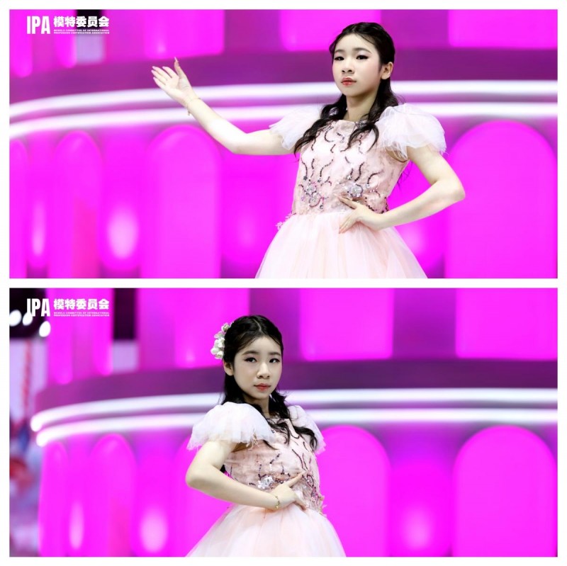 江姿莹在完美童模总决赛的舞台上宛若晨曦中走出的甜美公主,身着粉色无袖连衣裙惊艳亮相。上半身亮片刺绣如星辰点缀,多层薄纱裙摆如云朵般层层绽开,轻盈质感随动作泛起柔光涟漪。