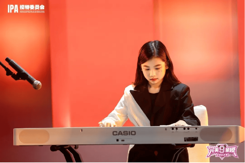 个人才艺节目展示中,林伽芯带来了一场精彩电子琴演奏。她身着一件黑白拼接的时尚套装,简约而不失大气。黑色与白色的经典搭配,展现出独特的时尚品味。内搭黑色衣物,与外套相呼应,整体造型利落又有型。林伽芯坐在舞台中央的电子琴前,专注地演奏着。她的手指在琴键上灵活跳动,旋律随之流淌而出,或激昂或舒缓,展现出扎实的音乐功底。舞台上的红色背景与她的服饰形成鲜明对比,使她成为视觉焦点。台下观众沉浸在她的音乐世界中,随着节奏轻轻晃动。林伽芯用音乐和时尚的融合,为总决赛带来了别样的精彩。