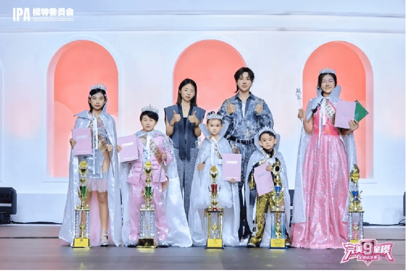 在第九季完美童模全球总决赛颁奖典礼现场,璀璨灯光聚焦舞台。林伽芯身着闪耀套装,头戴皇冠,身披银色披风,手持奖杯与证书,自信而夺目。整个赛程中,小嘉宾们在不同主题环节绽放光芒,展现了对时尚的独特理解与对梦想的不懈追求,诠释了第九季完美童模的主题。