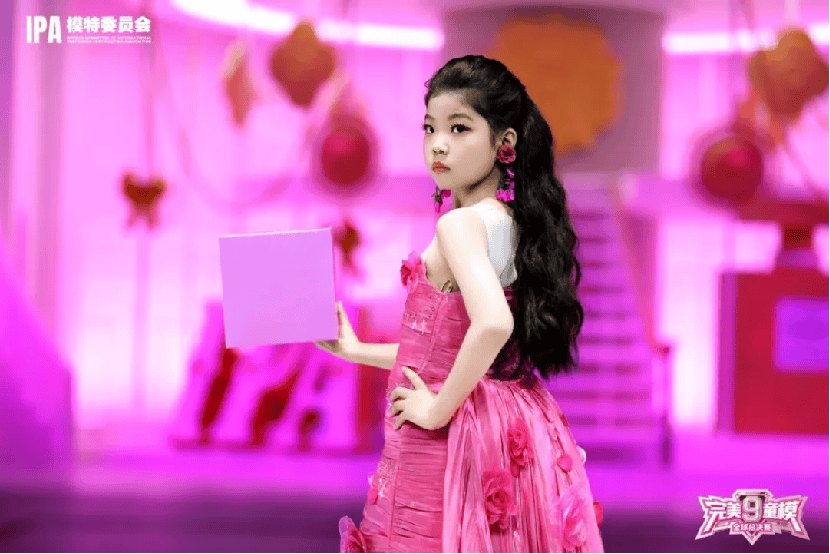 开幕式舞台之上,娜米娅 气场沉稳,手持粉色道具姿态从容,眼神清澈且坚定,将童真与时尚融合,每一个定格都传递出自信,把儿童走秀的灵动与仪式感诠释得恰到好处,仿佛天生为舞台而生,轻松拿捏开幕式展示的高光时刻。一袭粉裙梦幻吸睛,抹胸设计简约又不失精致,立体花朵点缀增添浪漫氛围,拖尾裙摆轻盈飘逸,搭配同色系耳饰与利落发型,甜美中透着时尚高级感,宛如从童话里走出的小公主,完美适配开幕式舞台的华丽基调。