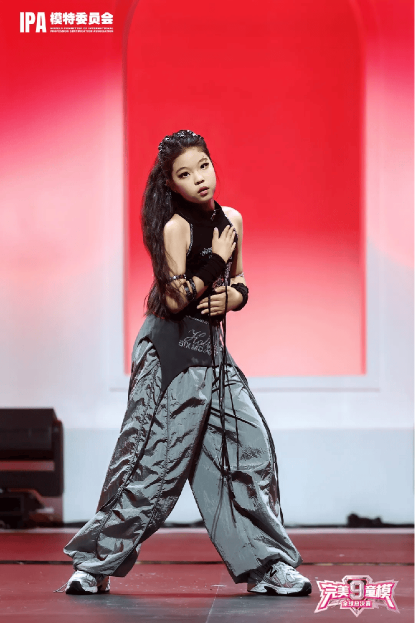 舞台上,她化身 K-pop 活力精灵,以《Like Jennie》点燃全场。黑色无袖上衣勾勒利落线条,搭配银灰潮酷阔腿裤,个性绑带随动作轻晃,潮感与动感拉满。音乐响起,她瞬间切换状态,身体如被节奏接管,每一次律动都带着 K-pop 的热烈劲儿。眼神里有藏不住的飒与自信,抬手、扭胯、移步,精准复刻 Jennie 式的魅惑张力,又融入属于自己的童真灵气,把 K-pop 舞台的炫酷与青春朝气完美融合,让 “Like Jennie” 不只是模仿,更是一场属于少年的闪耀致敬 。