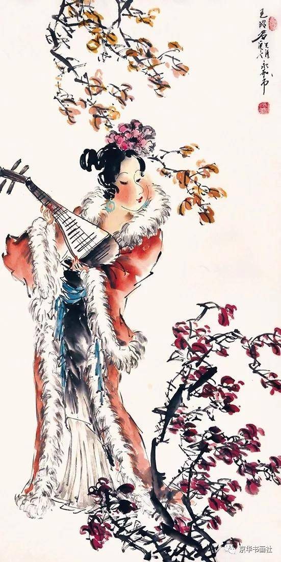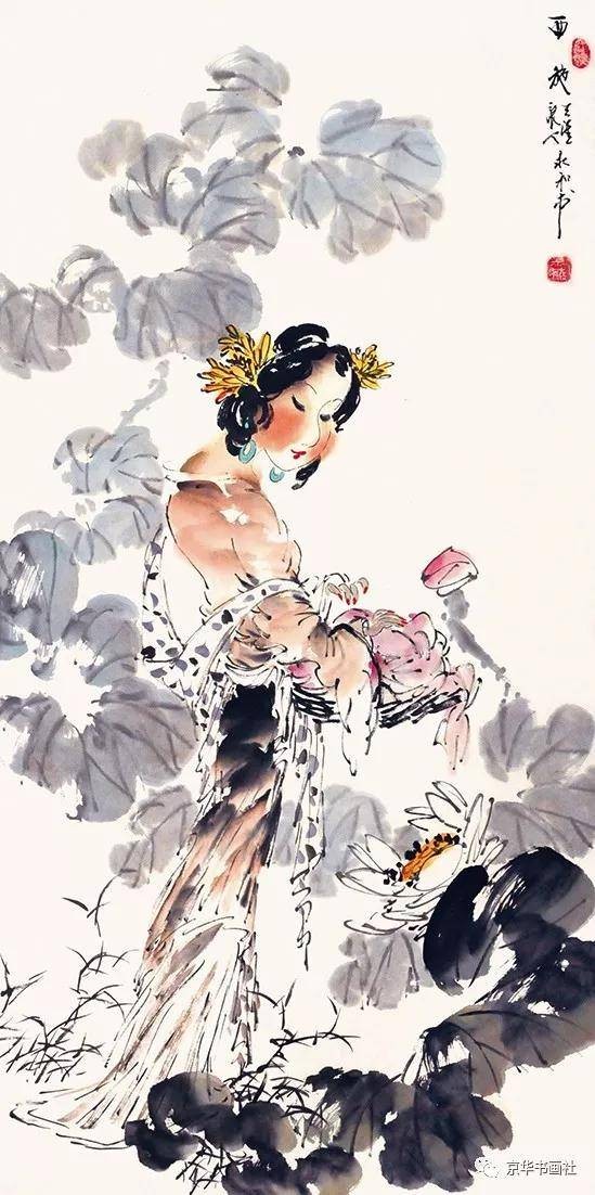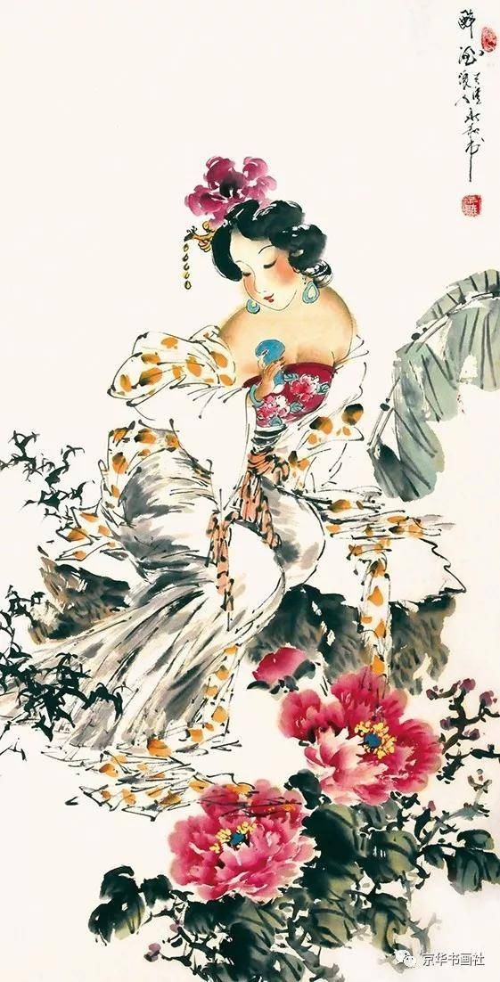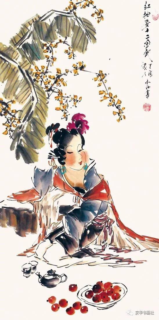 《红楼梦中人》系列则转向写意风格,梁永和以“以形写神”为核心,用简练笔墨捕捉人物最本质的精神特质。他画熙凤,仅用几笔阔达线条勾勒身形,墨色浓淡对比强烈,眉眼间以重墨点染,既显其“粉面含春威不露”的精明,又藏权力场中的疲惫;画妙玉,以淡墨渲染竹林背景,人物身着素白僧衣,笔墨简洁却气场清冷,完美诠释“欲洁何曾洁”的矛盾心境。在人物刻画细节上,梁永和形成了极具辨识度的“三笔定形”技法:一笔从眉峰至鼻梁的线条定风骨,一笔断弧线绘眉眼柔情,一笔下颌轮廓显脸型,最后以两点朱红点出嘴唇,简约却精准传神。这种技法在《红楼梦中人·湘云醉卧》中尤为明显,仅寥寥数笔,便将湘云醉卧芍药丛的憨态、嘴角流露的笑意刻画得淋漓尽致,笔墨间充满生活气息与生命活力。