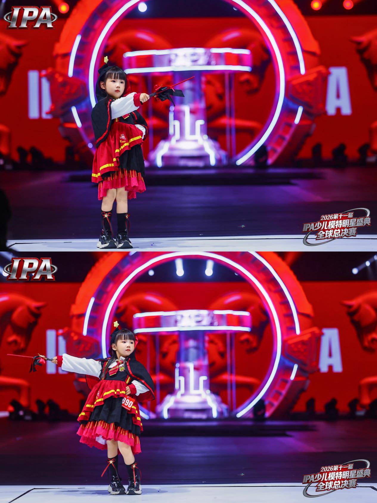IPA 校服秀环节,她身穿红黑撞色魔法学院风校服,斗篷披风、条纹领带与层叠裙摆设计感十足,搭配手中魔法杖,灵动又充满仪式感。她气场舒展、表现力饱满,将少年的灵动与勇气完美释放,化身舞台上耀眼夺目的小魔法师。