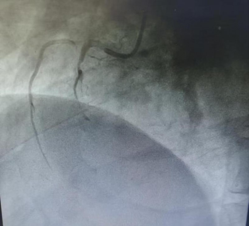 复查心电图明确诊断为急性下壁心肌梗死,病情极其凶险。冠脉造影结果显示:冠脉三支严重病变,其中右冠状动脉中段急性完全闭塞,伴大量血栓影,合并右冠自发性夹层,属于极高危复杂病变,随时可能再次发生恶性心律失常、心源性休克甚至猝死。